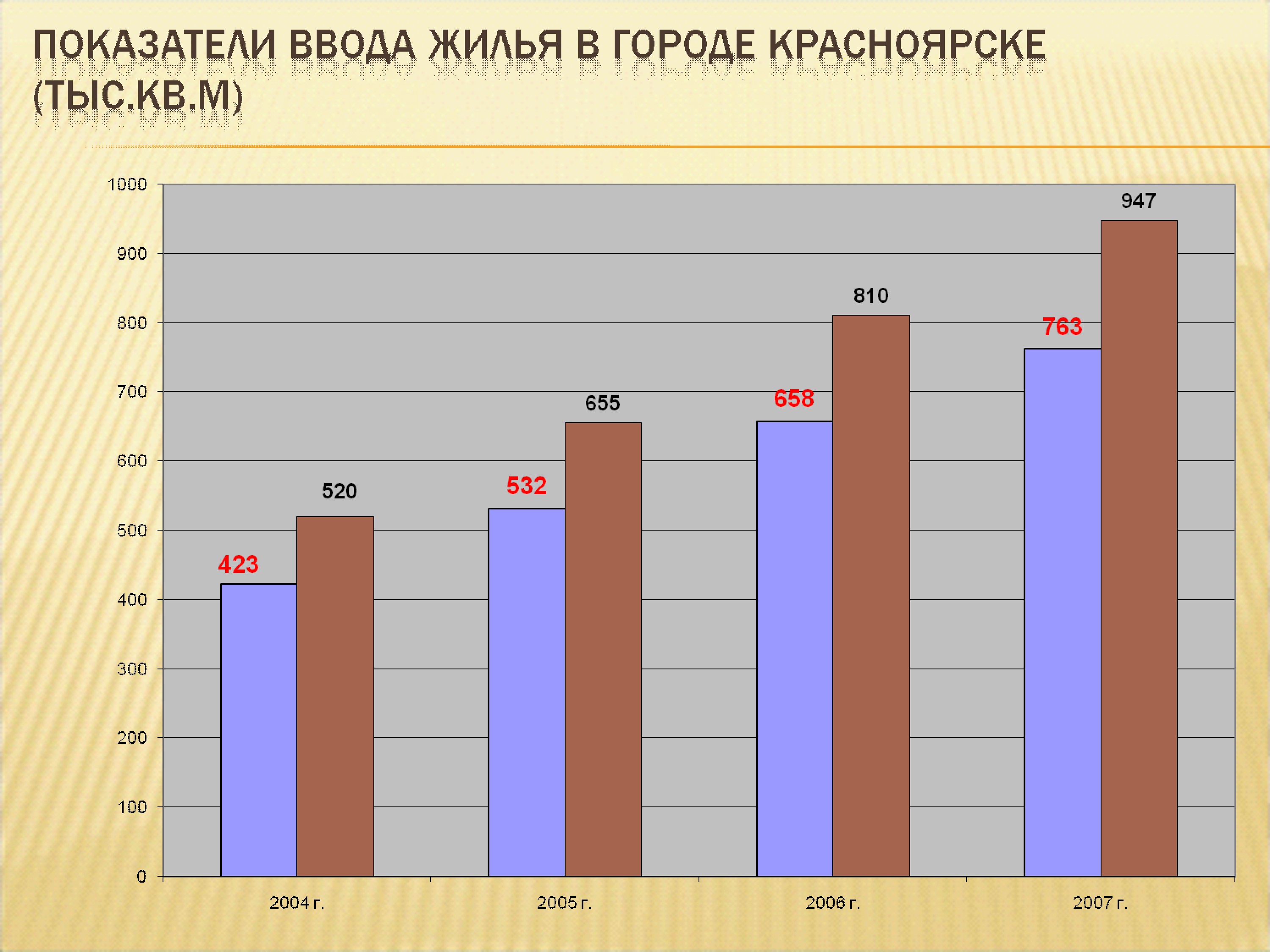 Красноярск Основная деятельность администрации города в области градостроительства в 2007 году была направлена на реализацию приоритетного национального проекта «Доступное и комфортное жильё – гражданам России», которым поставлены следующие задачи: -увеличение объемов жилищного строительства и модернизация коммунальной инфраструктуры -повышение доступности жилья -выполнение государственных обязательств перед отдельными категориями граждан -увеличение объемов ипотечного жилищного кредитования В городе Красноярске в последние годы в результате реализации комплекса мер по совершенствованию системы и механизмов развития жилищной сферы были созданы предпосылки для эффективного достижения поставленной президентом Российской Федерации стратегической цели формирования рынка доступного жилья и обеспечения комфортных условий проживания граждан России Повышение качества жизни горожан напрямую связано с темпами реализации основных положений Генерального плана города, улучшением качества жилого фонда и обслуживания, повышением комфорта и эстетики городской среды. Генеральный план города на расчетный срок до 2020 г., был утвержден 30 марта 2001 года В развитие генерального плана разработаны: - проект городской черты Красноярска - основные направления развития жилищно-гражданского строительства в городе Красноярске на период до 2010 года; - комплексная транспортная схема города до 2015 года - Правила землепользования и застройки - разработаны проекты планировки перспективных жилых районов Обеспечение доступности жилья для населения возможно лишь при условии увеличения объемов жилищного строительства. И в этом смысле, можно с уверенностью сказать, что благодаря выбранной стратегии деятельности администрации города стабильно растут объемы жилищного строительства. За прошедшие 2004-2007 годы в городе построено 2375,7 тыс. кв.м. жилой площади, что составляет почти 40 тысяч квартир. Объем введенного жилья в 2007 году составил 763 тыс.кв.м. (12 тысяч квартир). Рост объемов жилищного строительства к 2006 году составил 17%. По сравнению с 2003 годом объем вводимого жилья увеличился в 2,8 раза. Уже третий год подряд город Красноярск является лидером среди городов России по такому показателю как количество введенного жилья на одного жителя. С 2004 года до 2007 этот показатель вырос с 0,57 до 0,83 кв.м.